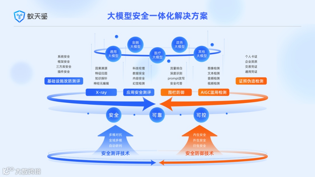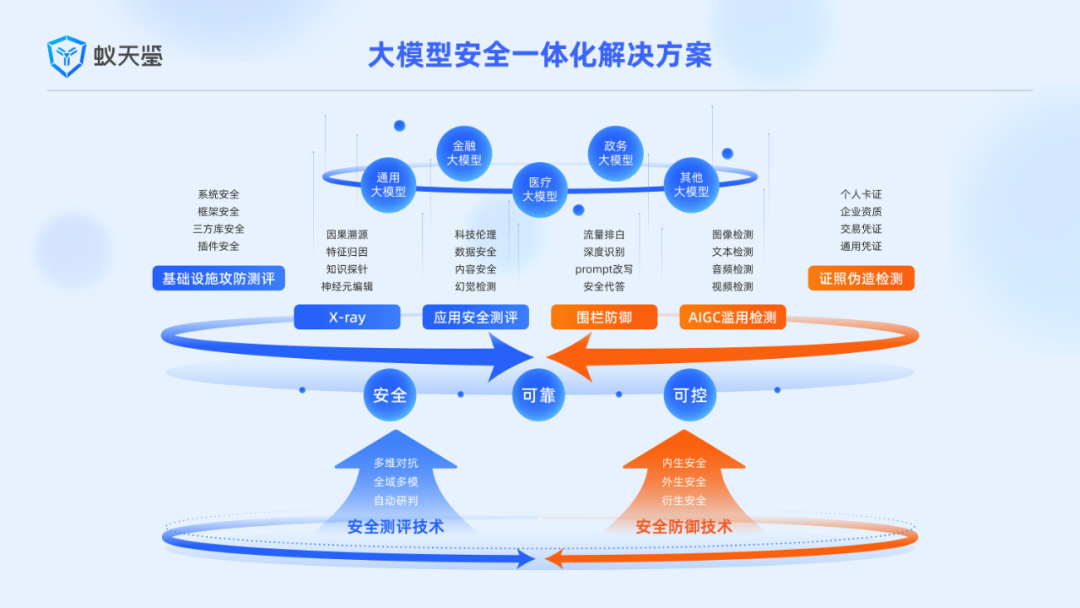 也就是说,“蚁天鉴 2.0”形成了一套包括大模型基础设施测评、大模型X光测评、应用安全测评、AIGC 滥用检测、证件伪造检测、围栏防御等在内的完整技术链条,面向行业提供全方位智能化的大模型安全评测和防御解决方案。未来,当大模型在细分领域得以大规模应用,期待“蚁天鉴”成为基石。