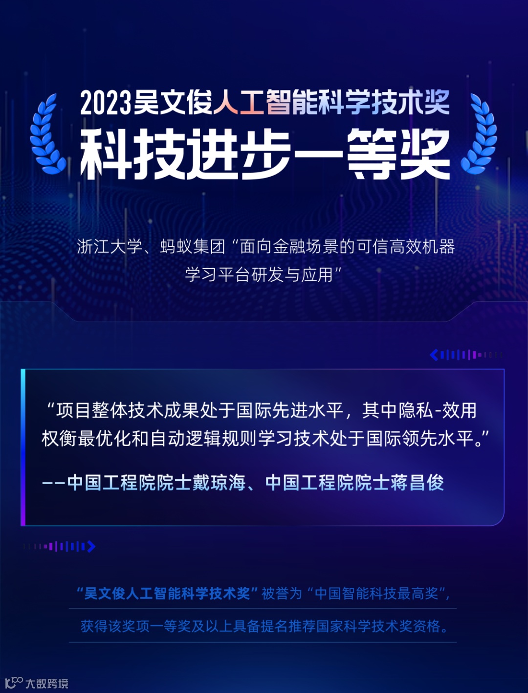 近日,中国人工智能学会发布了《2023 年度吴文俊人工智能科学技术奖奖励公告》,蚂蚁集团与浙江大学共同完成的“面向金融场景的可信高效机器学习平台研发与应用”项目获得“吴文俊人工智能科学技术奖科技进步一等奖”。