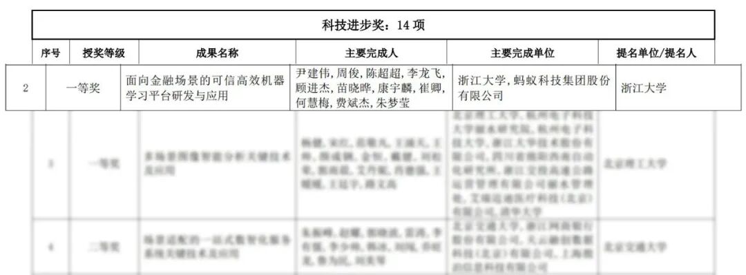 这是蚂蚁连续第三年获此殊荣。此前,蚂蚁集团与北京邮电大学联合研发的“金融智能图机器学习系统的研发与大规模应用”项目,获得了“2021 吴文俊人工智能科技进步一等奖”。清华大学与蚂蚁集团联合完成的“无约束人像目标智能感知与理解”成果,获得了 “2022 吴文俊人工智能自然科学一等奖”。