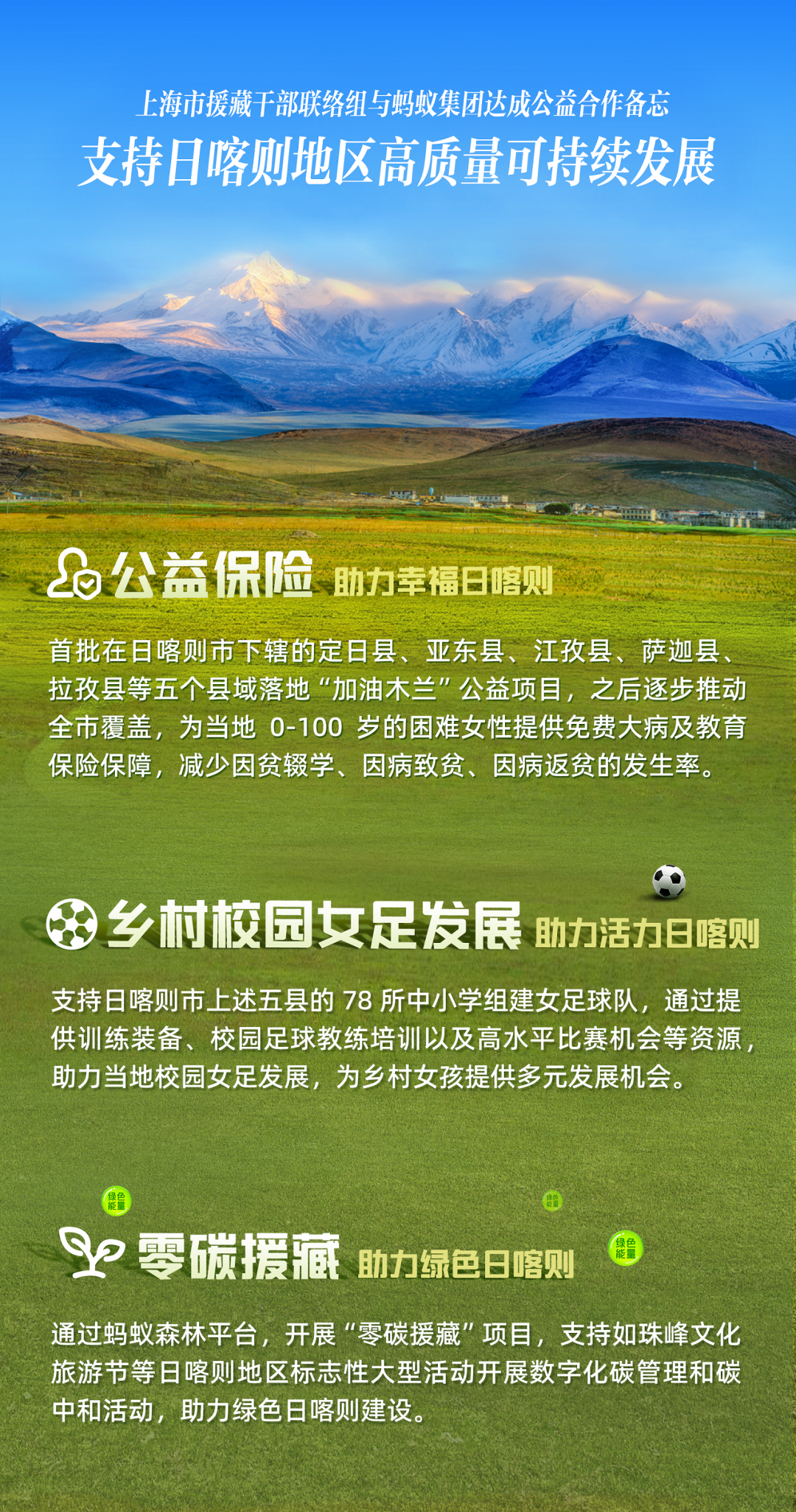 5 月 20 日,上海市援藏干部联络组与蚂蚁集团签署公益协作备忘录,双方将从公益保险、乡村校园女足发展及零碳援藏等公益民生方向开展合作,共同支持日喀则地区高质量可持续发展。