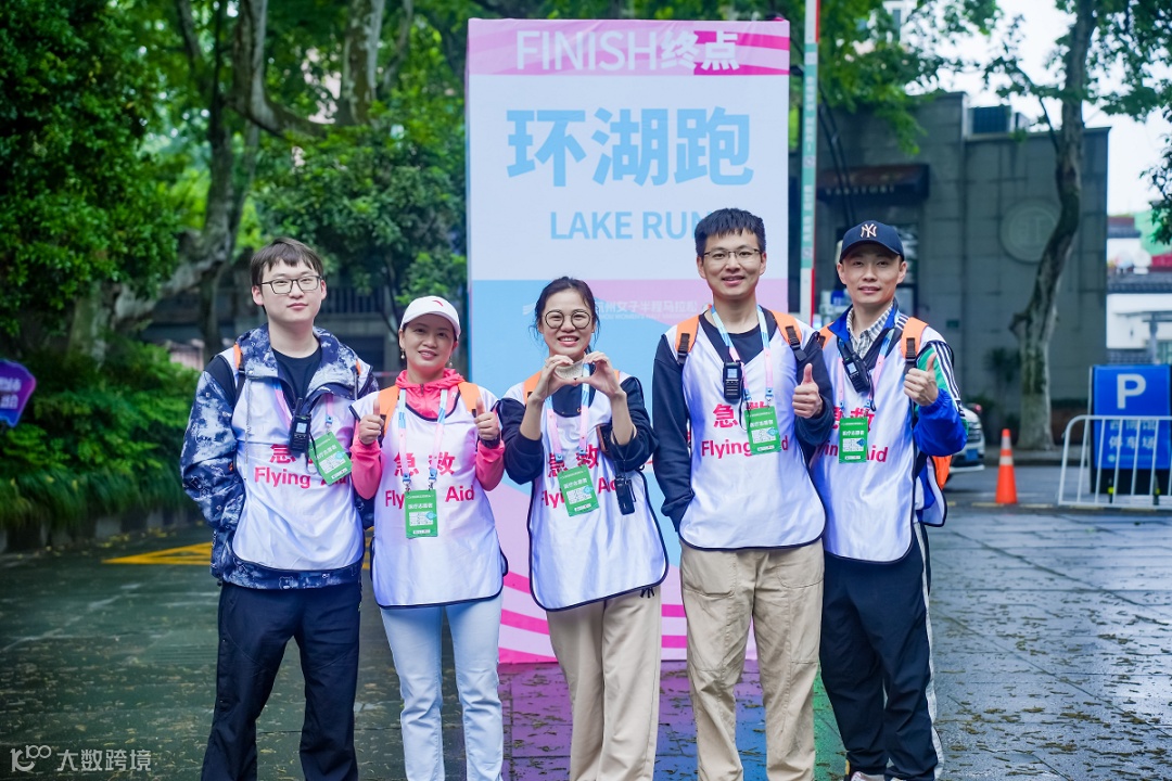 凌冠(右一)与蚂蚁急救团志愿者参与 2023 年杭州女子半程马拉松急救保障工作