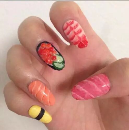 甜虾寿司、蛋寿司、鲑鱼寿司,这些寿司美味如今也成了年轻女孩的美甲新选择。据了解,寿司造型的设计者名叫Ayamon,来自日本名古屋。Ayamon将这些造型的近距离照片上传至社交网站“推特”后受到了广大网友的追捧,更是让美甲爱好者们对指甲艺术爱不释手。