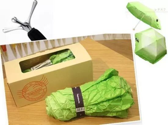 翠绿的颜色、褶皱的菜叶、紫色的生菜捆绑胶带……乍一看,这仿佛就是一颗新鲜的生菜。但其实它是一把折叠伞。这款折叠伞名为“Vegetabrella”(蔬菜伞),晴雨兼用,售价4725日元。Vegetabrella不仅重现了生菜叶的褶皱,就连捆绑的方式都与生菜一样。外包装为纸板盒设计,若从正中间朝内看,就像是一个真正的生菜。撑开后由绿变白的渐变色也很栩栩如生,让人爱不释手。