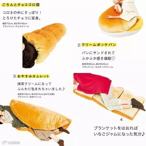 完成了一天的工作,拖着疲惫的身躯回到家中,你是不是也曾想要尝试睡在松软的面包里美梦一场呢?日本原创设计品牌芬理希梦(felissimo)就曾推出过一系列“面包睡垫”,共有四款,造型分别为巧克力卷睡袋、奶油口袋面包垫、切片吐司坐垫和抹茶蛋饼羽绒被。