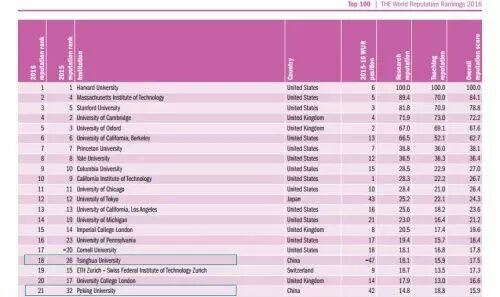 トップ100校に入ったのは、清華大学・北京大学・復旦大学・上海交通大学・浙江大学の5校。このうち清華大学は第18位、北京大学は第21位と、中国の大学で初めて上位20校ラインに近づいた。復旦大学と上海交通大学は第71位から第80位のグループ、浙江大学は第81位から第90位のグループに、それぞれランクインした。