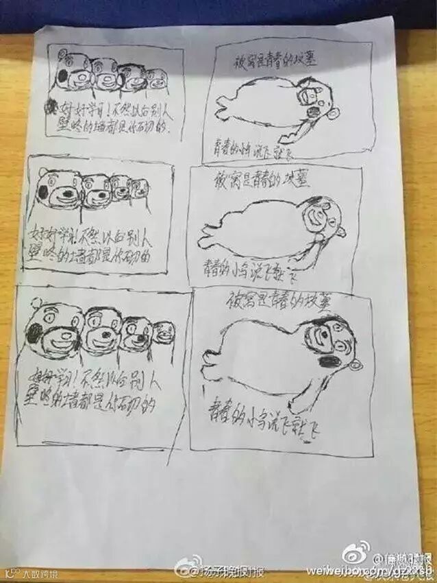 10日上午,湖南邮电职业技术学院移动通信系有5个同学旷课,辅导员知道后将此5人拉入名为“中华新文化初体验小组”,罚抄「熊本熊表情包」。旷课一节,就要抄满两张A4纸。11日早上便有5名旷课学生化身画家开始罚抄表情包,其他同学得悉后笑着纷纷表示“再不敢旷课了!”
