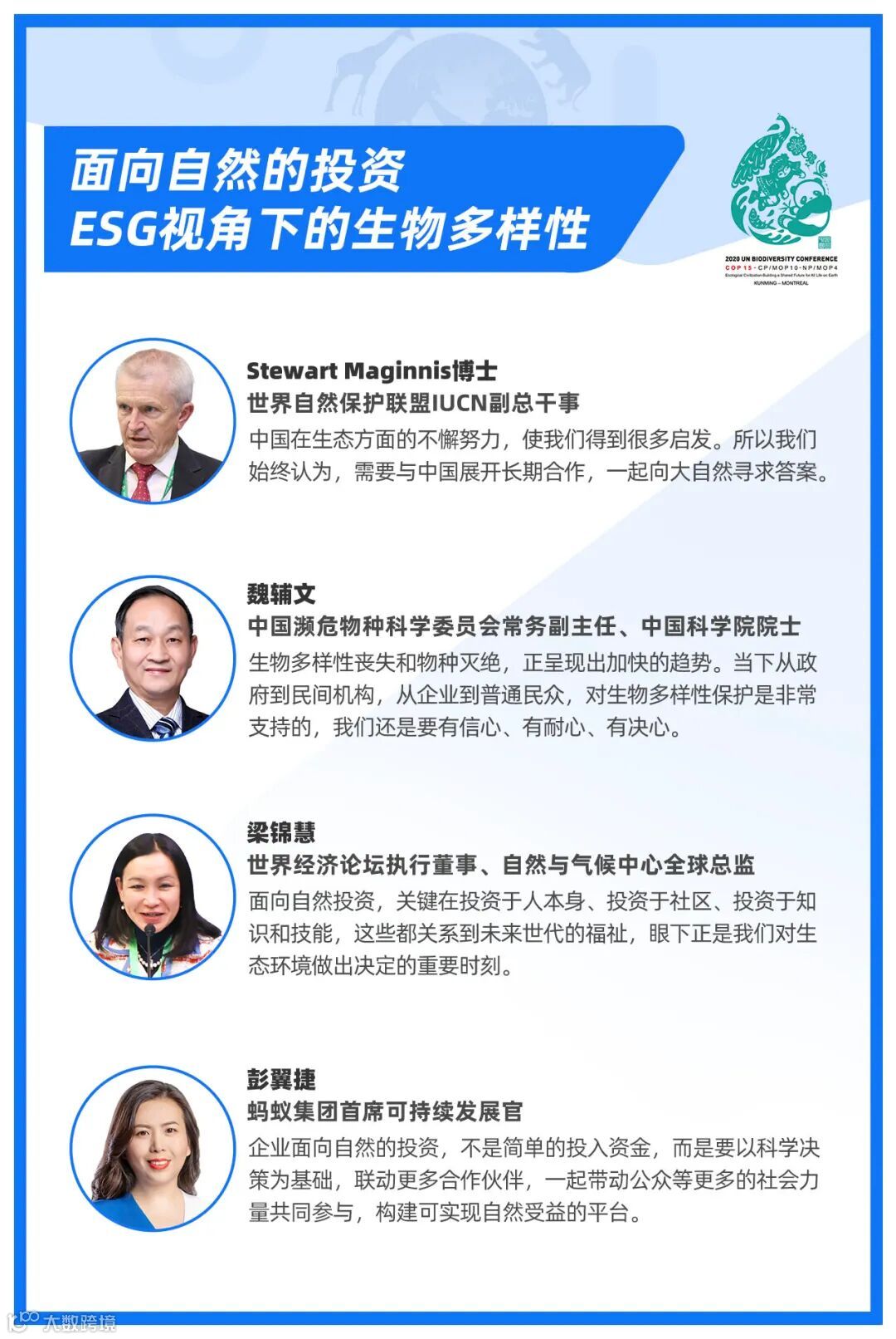 “人因自然而生,人与自然是一种共生的关系。推动人与自然和谐共生的新格局,已经成为包括企业在内的中国全社会的共识”,中国生态环境部副部长、COP 15 第二阶段会议中国代表团团长赵英民表示:企业可以和其他生物多样性利益攸关方一道,发挥更大的作用、承担更大的责任,为共建地球生命共同体作出贡献。