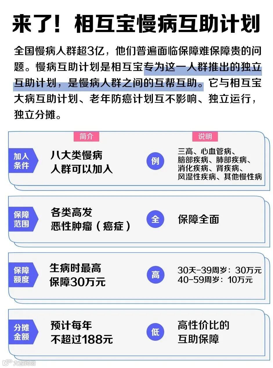 刚刚,相互宝上线了独立的「慢病互助计划」:三高、心血管病、肾炎、风湿、消化疾病、肺部疾病等八大类慢性病用户,可加入新计划互帮互助,获得防癌保障,最高30万。