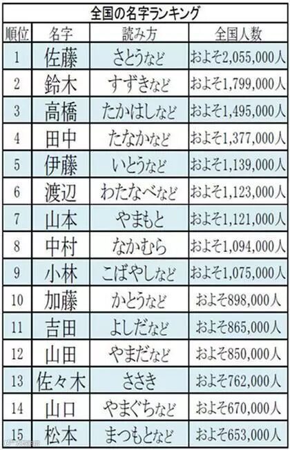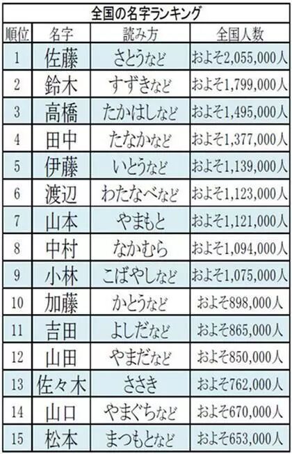 2015年3月26日、リクルーティングスタジオは「全国・都道府県別名字ランキングベスト3500」を発表。全国で最も多い名字は、「佐藤」だった。藤原秀郷の末裔、左衛門尉公清が佐藤を称するに始まったとされている。また、家族が藤原氏のように公家を担い、繁栄するようにとの願いが込められているのではとの見方もある。2位は「鈴木」だった。鈴木は、紀伊国熊野の豪族である「穂積」姓がルーツではないかとされている。