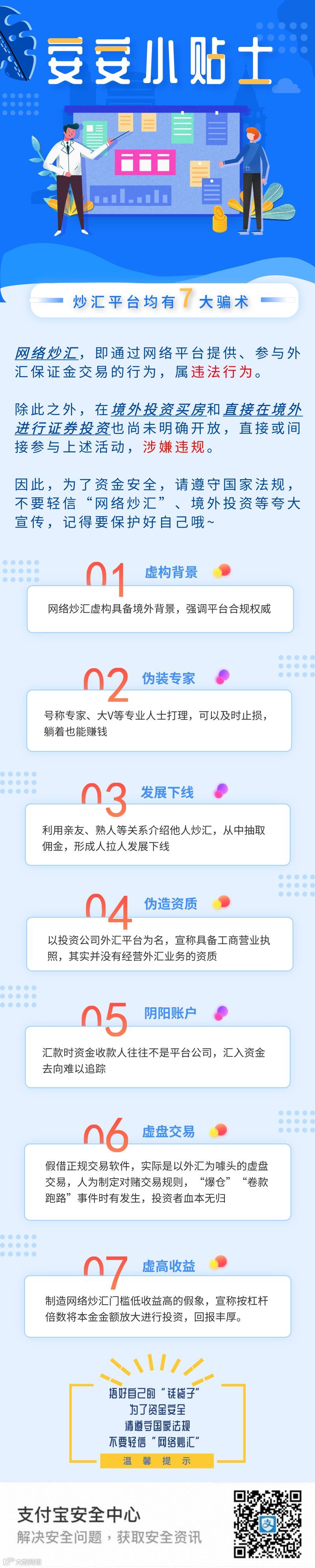 为了资金安全,请投资者遵守国家法规,不要轻信「网络炒汇」夸大宣传,坚决远离网络炒汇活动,以免上当受骗、追悔莫及。支付宝也将一如既往地配合国家外汇管理局防范和打击非法网络炒汇、境外投资等违规行为,绝不姑息!