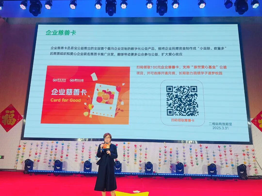杨赫介绍,企业慈善卡是易宝公益推出的全国首个面向企业定制的数字化公益产品,能将企业捐赠资金制作成“小面额、数量多”的慈善组织和爱心企业联名慈善卡推广分发,带动更多公众参与公益,扩大爱心效应。本次活动定制的企业慈善卡全部用于支持“崇世爱心基金”公益项目,现场观众在使用慈善卡体验捐赠的同时,还可选择开通月捐,长期助力困境学子逐梦校园。