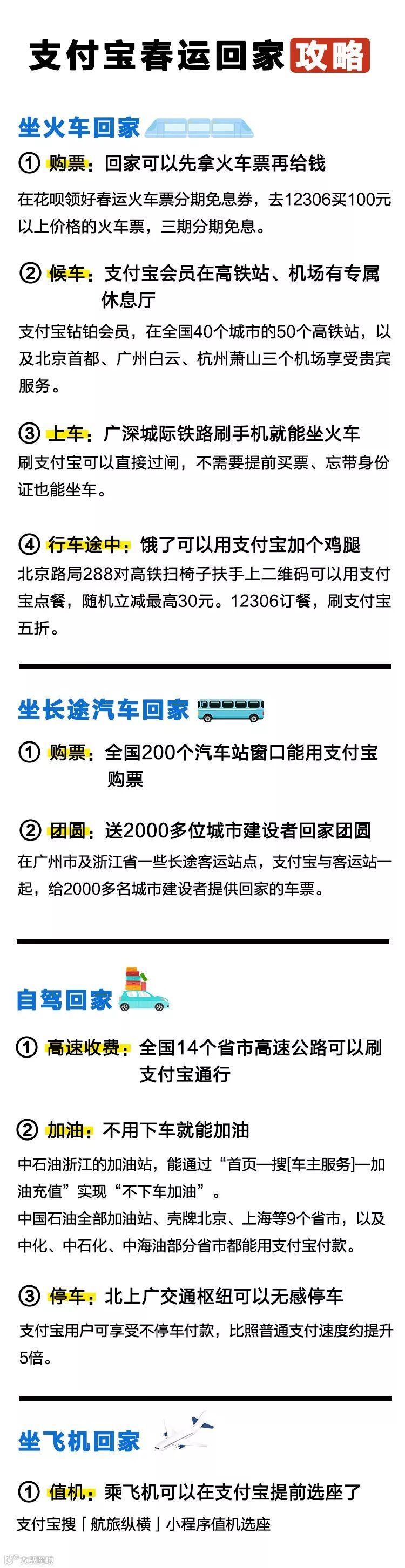 为提升通行效率,今年春运期间,车主在广东高速及华南快速用支付宝付费大于5元,就有望获得立减优惠,最高免单。活动期间,每位车主最多可享受2次随机立减。河南、湖北、浙江、山东、江西、湖南、上海、天津、甘肃、江苏、福建、重庆等多个省市高速,都有支付宝扫码立减活动。