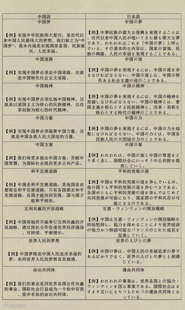 中国共産党第18回全国代表大会(十八大)以降、習近平総書記が「中華民族の偉大なる復興」という「中国の夢」を提唱し、それについて深く論じた。今回は「中国の夢」というテーマを中心に、9つの用語を選択しており、中には、「中国の夢」の基本的な内容、実現するための道、「中国の夢」と世界の関係などの問題が含まれる。中国や海外の読者が用語をよりよく理解、用いるために、用語ごとに説明の例文が付されている。用語と例文は主に『中華民族の偉大な復興という中国の夢の実現に関する習近平氏の論述・ダイジェスト版』から抜粋している。