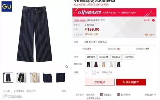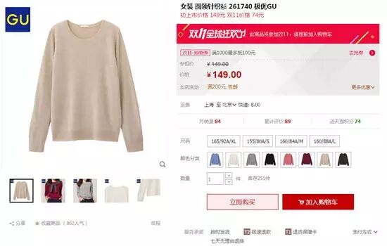 优衣库旗下品牌GU 8月24日正式入驻天猫。以“让时尚更自由”为使命的GU,在日本以平价提供最新、最好玩的时尚,受到众多年轻人追捧。相比于优衣库,GU的定位更年轻、新潮、自由。GU在日本拥有315家店铺,于2013年进入中国市场,相继在上海开出两家门店。虽然仅入驻不到3个月,但GU 同样以积极姿态参与双11大促,推出了多款特惠商品。