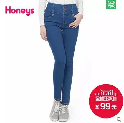 三扣高腰牛仔裤频频出现在各大杂志上,可谓是今年大热的一款单品。Honeys这款高腰牛仔裤使用超强伸缩性牛仔裤,便于活动,凸显腿部线条。同时三粒扣高腰设计,拉伸整体比例,后腰的弧度设计也可修饰臀型。