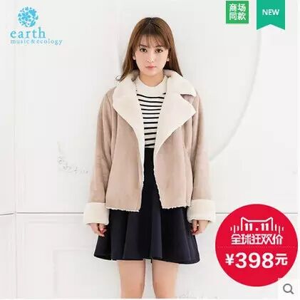earth music2015年冬季新品,同时也是双11专享款。有大翻领设计的羊羔绒外套是今年秋冬大热。在温暖可爱的同时,还透露出一丝帅气。搭配牛仔裤或者甜美短裙皆可。