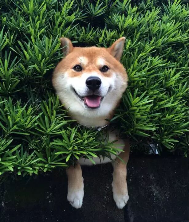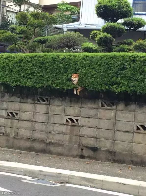 ツィッターユーザーが8月17日午前中に公開した一枚の写真。不幸なことに頭が垣根に挟まれた日本の柴犬、そのコミカルな表情が笑いを誘う。