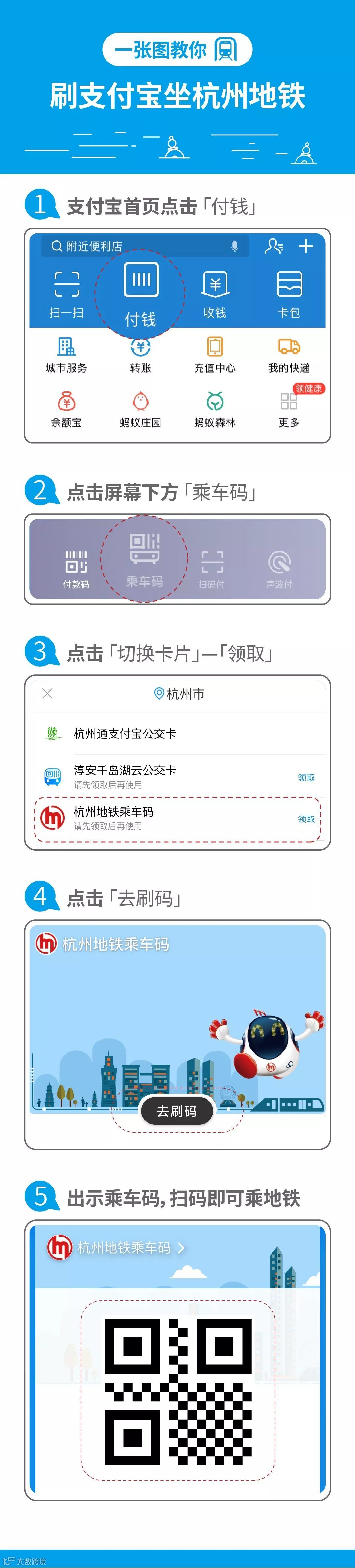 乘客只需在支付宝内领取「杭州地铁乘车码」,乘坐地铁时,在支付宝首页点击「付钱-乘车码」,找到「杭州地铁乘车码」的二维码,在地铁闸机上扫一扫,就可以入闸乘车了。