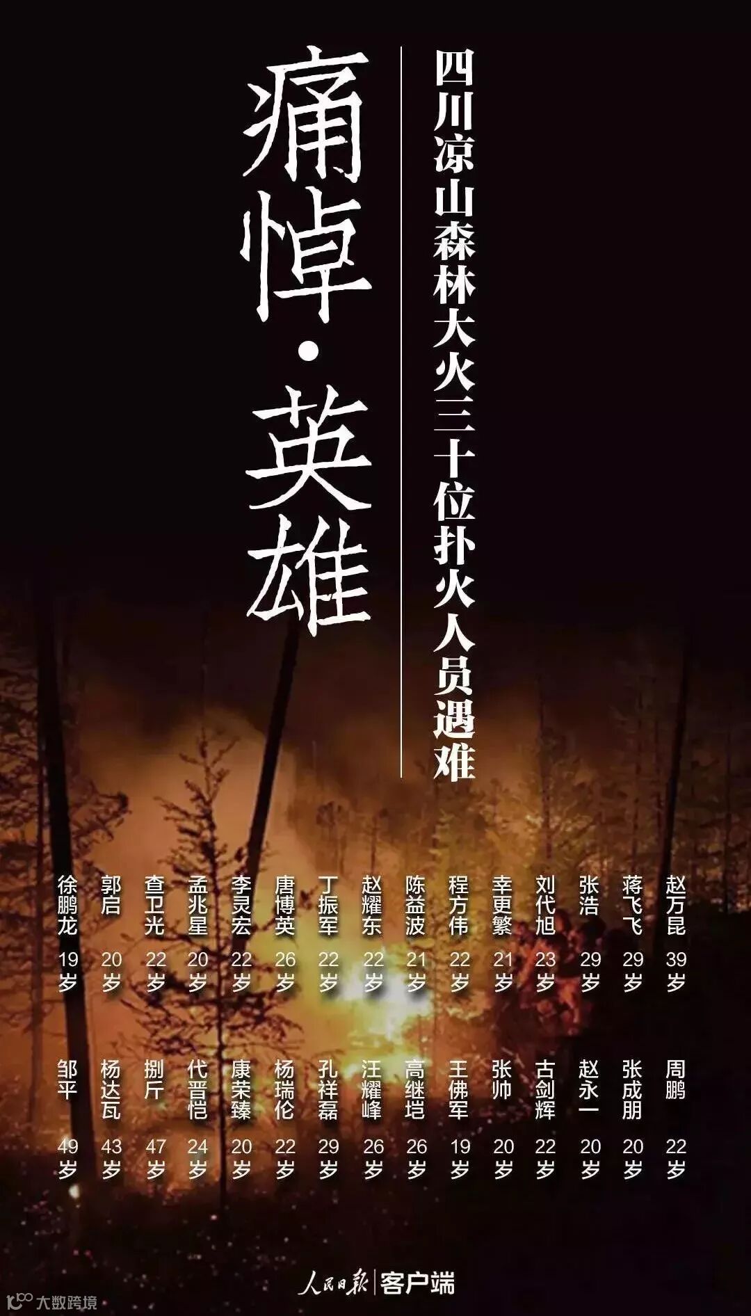 3月30日下午,四川省凉山州木里县境内发生森林火灾。30名扑火人员,在扑火行动中,遇到了突变风向引发的林火燃爆,瞬间被巨大的火球吞噬,全部壮烈牺牲。凉山州人民政府将2019年4月4日定为哀悼日,为英雄们举行追悼会,祖国各地泪别30位英雄。