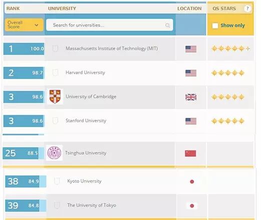 9月15日,教育机构QS公布了最新世界大学排名。美国麻省理工学院位列榜首,美国哈佛大学紧随其后,英国剑桥大学与美国斯坦福并列第三。中国大陆共有4所大学杀入百强,其中清华大学较去年跃升了22个位置、排在第25位,成为2006年以来中国大陆首个进入世界25强的大学。北京大学、复旦大学和上海交通大学分列第41、51和70位。新加坡国立大学领跑亚洲、排名第12位,南洋理工大学上升至第13位。