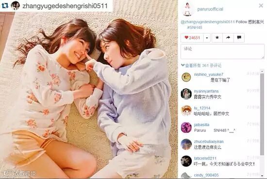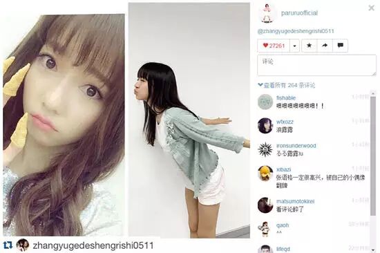 9日,SNH48张语格在自己的Instagram上发布了一张拼图照片,看起来很像她正在亲吻岛崎遥香,同时她用日语向岛崎遥香“示爱”:“任何时候都支持你!”