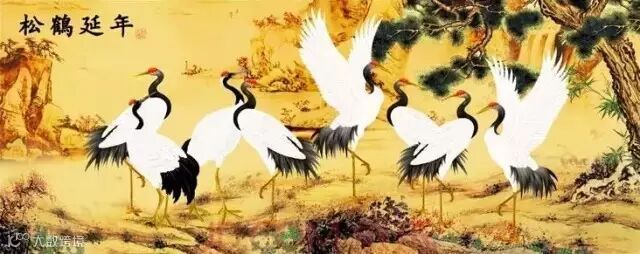 松鶴延年とは長寿を祝う絵だ。満開の菊の花の傍に丹頂鶴の群れが立ち、福や長寿、喜びや満足を表現する。菊、鶴、松はいずれも長寿の縁起のよいシンボルで、「松鶴延年」の寓意を表す。一般にこの絵を見ると、一家に長寿の人がいるとわかる。