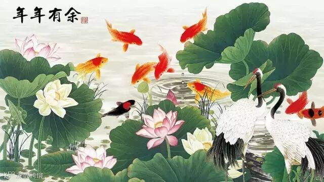 蓮の花と鯉からなる縁起のよい絵で、蓮と「連」、魚と「余」の語呂合わせで「連年有余」と呼ばれる。豊かな生活、富への願望と祝福を表す。
