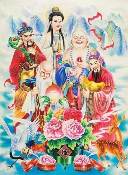 福禄寿三星とは三位一体のイメージで登場する。中央が賜福天官で手には如意を持つ。右が禄星で員外郎に扮し、頭には牡丹の花を挿し、懐に赤ん坊を抱いている。寿星は左側の南極仙翁で、大きな顔に白いひげ、杖を持ち、笑顔を浮かべている。この絵は大きな福や立派な職業、長寿、多くの幸福、財産の寓意を持つ。