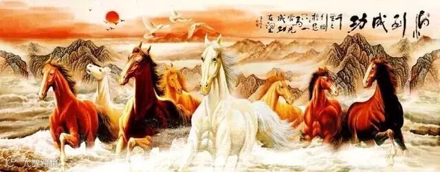疾走する馬の生き生きとした姿は、人間に奮闘する力を与え、前進する喜びを感じさせる。万馬奔騰の絵は成功を表す。
