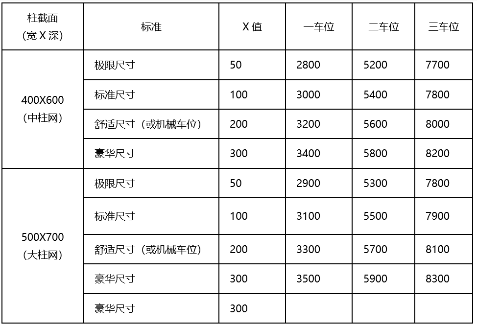 但柱跨尺寸总是有限,所以这个导致进车舒适性的纵向柱跨的资源就是有限的。按照下图,其X取值就是舒适性关键数据,是规范规定车位最小值之和的溢出的尺寸,其值越大舒适性越好。X值实际上最小要有50,满足基本面层的构造厚度,X值取0的情况是不存在的。如果X值是100,就是整个柱跨多200,每边扣掉面层留少量余地,这个尺寸是采用比较多的标准尺寸。但从目前实际上看,这个尺寸属于偏小,原因在于,随着生活水平的提高,采购车型也越来越大了,规范规定的车体宽度是1.8m,但实际上1.9米宽的车型很多,而且个别车宽度超2米的也有。那么实际使用还会有停车不规范等情况,导致容错能力交叉。我们虽不能都按大车型做设计,但也需要考虑大部分车体以及车体与车体组合时的场景是舒适的。所以,如果X值取200,扣掉面层,相当于每个车位增加了100宽,那么即使有一辆车是停2米宽的车型,也不会导致整体停车舒适性降低。甚至副驾驶打不开车门情况等。对于豪华车位柱跨常规就是8.2~8.4米,也没太多必要增加更多,再多就可以做独立车库了。