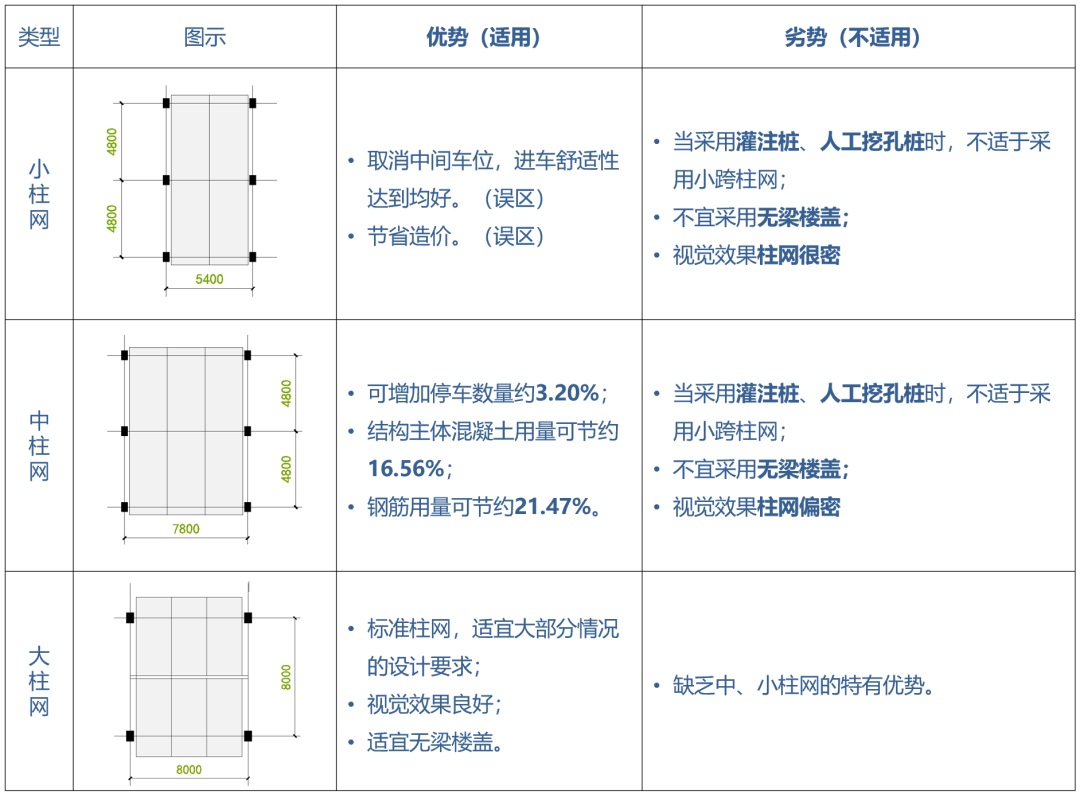 下面我们来讲“标准柱网”,是指停车控的标准柱网。我们常用的跨度尺寸选择,有三类,我们统一命名为,小柱网、中柱网、大柱网。一辆停四辆及以上的,是超大柱网,不在我们这次研究范围。