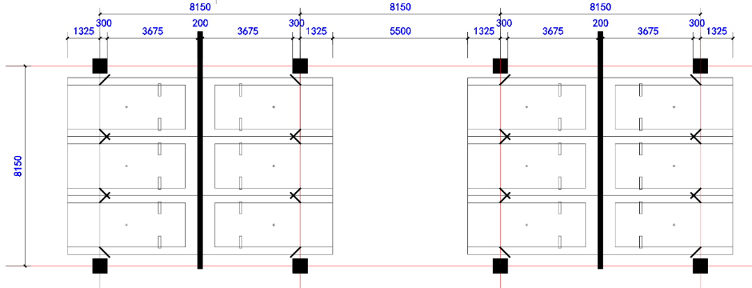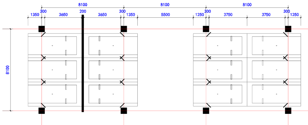 我们先从大柱网(标准柱网)来研究,纵向分为车带和行车道,对于大柱网也是两跨,那么这两跨尺寸是否一样呢?按照前面讲过的原则,停车柱跨在保证车门很容易打开后,剩余空间全部都给行车柱跨。可能行车跨可能是7.7米,而停车跨可能是8.4米(也考虑了车尾可能会有防火墙的情况),也就是奇偶跨尺寸是可能不同才能达到最理想的尺寸。这种柱跨就是所有使用方面达到最佳。理论上说,这种尺寸的横向柱跨没什么不对,而且非常符合精细化设计的理念。但有时我们的车库排布车带的时候,方向没那么一致,可能会有转换方向的时候,这时候横纵柱跨对调了。实际上也不矛盾,如果仅是端跨,少量对不齐就好,有点像中柱网的端跨处理措施;如果是区域性的方向对调(实际上不太多),通过柱跨调整也不是问题。但横柱跨相等甚至纵横柱跨相等(跟转换方向也有关)有着很大的需求。为了实现等柱跨,就需要牺牲少量的开车门舒适性,也能打开,没那么自由。下图两个方案根据防火墙位置做了尺寸分解,极端情况(每车带一道防火墙)需要8150,车头到柱后尺寸达到1625,我们经验数十1550几乎是极限。两车带一道防火墙就可以实现8100柱跨,最不利开车门尺寸是1650了。