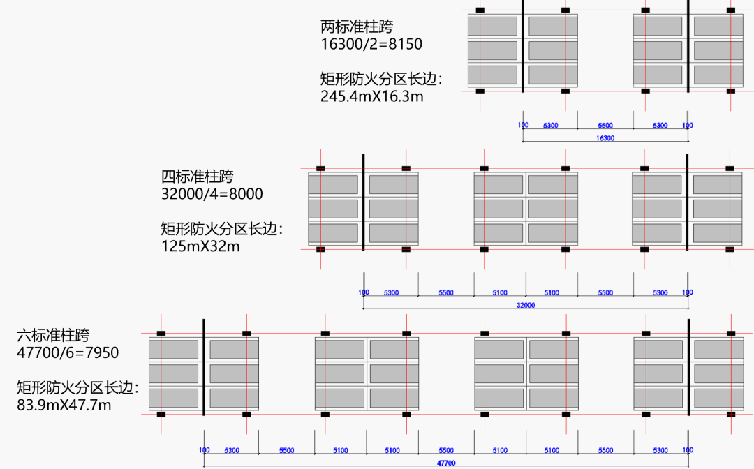 还有三车带一道防火墙的,柱跨可以做到7950,也就是说8000的常用柱跨在这种情况下才试用,而且开门舒适度降低(因为车型有差异,这个尺寸越大就适应范围变小)。下图是三个尺度的对照。但数据有不同,因为车尾对车尾时,按照规范车位长度可以做到5100,也就是说两车带一道墙8000柱跨也是可以实现的,但这种情况大部分情况不宜这么做,特别是往下充电车位越来越多,车尾还要考虑有充电桩等设施。三个图其中一车带做分区界限不常见,矩形防火分区长边达到250多米,一般是两三跨常见。严格是说8100柱跨远比8000柱跨适用面广。