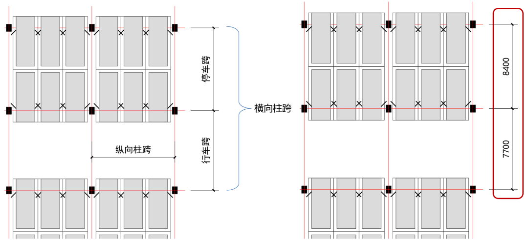 纵向柱网是进车位置,往往纵向柱跨对舒适度影响会更大,我们总是愿意停车位宽度比较宽的车位。如果车位纵向尺寸有点不足(相当于挤压了进车车道尺寸),我们可以容忍。因为规范规定的进车尺寸是指打一把方向盘就可以进入的尺寸,实际上打两把进车也不算啥。同时车位宽度比较宽对于车技不佳的人也比较有利,给了多打几把的可调空间。