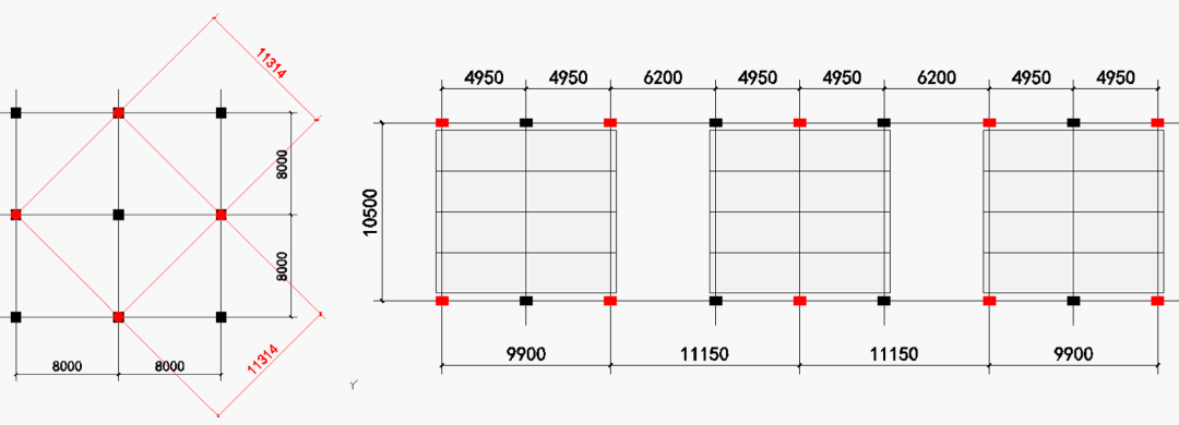 往下,先不说中柱网,那么大柱网是采用的比较多的方式。很多开发商只认可这类柱网,属于真正意义的“标准柱网”。那么这类柱网确实有着比较大的优点,很通用,实现的空间效果比较好,也适宜做无梁楼盖,任何基础形式也合适。那么在经济性方面,不具有太多特点,很多情况,是不如中柱网。