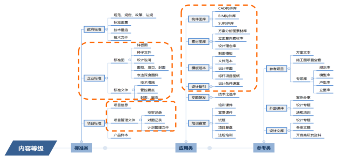 数据资产来自哪里呢?我们设计公司是以项目为尊,自然主要数据来源是项目设计过程及项目管理。首先我们项目启动,需要有知识的输入,这个知识的输入封闭了很多问题,让设计师不至于走偏,这是获得及格线的基本措施。设计输入端的数据都是经过沉淀整理过的,其数据质量非常高。比如:特意编制的标准,标准设计说明,样板文件,各类设计指引、设计要点等。设计过程也可以产生数据,比如管理记录、项目级的技术措施,校审记录,对图记录以及往来文件等;这些数据,我们除了处理跟本项目有关的事宜以外,我们很少利用去影响其他项目。我们收集及利用的手段很有限。最终的设计成果,是更加有用的数据资产,我们除了作为投标业绩证明、评优资料等以外,还可以形成未来设计项目的参考等价值。显然我们以上所提到的数据质量是不同的,有着高质量的,比如:输入端的标准类数据;也有泛泛的,比如各类表单;成果文件质量很高,但其颗粒度很大,标准程度低,我们又很难遇见相似度很高的项目,用于参考没问题,直接使用其内容,有难度。实际上我们设计过程,我们光有质量很高的标准类数据还是不够的,我们不知道在不同项目上会遇见哪些自己不知道的内容,我们需要查阅很多资料,那么这些资料的数据,像一个大海一样,我们要去找到我们想要的内容。即使我们有这些资料,获取也是有难度的。这些资料的准确性不敢保证,也许是过时的。所以我们应该把知识数据做一下分级。