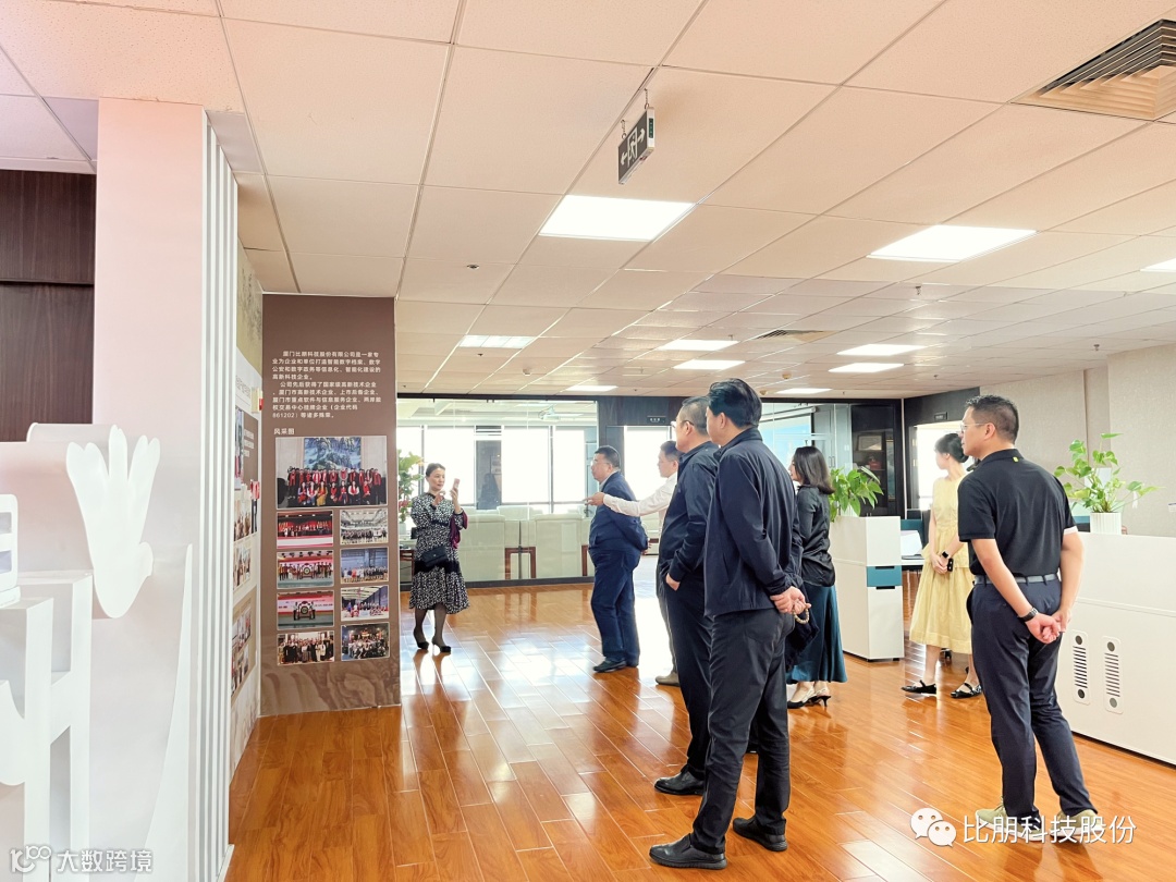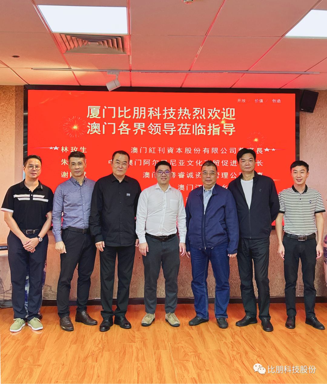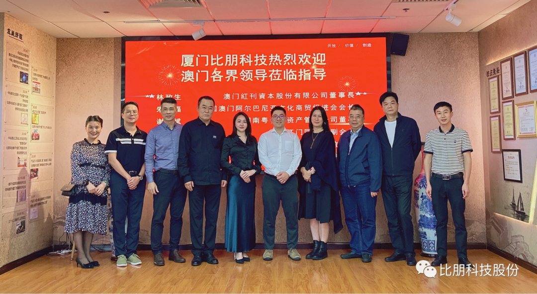 11月2日,澳门红刊资本股份有限公司董事长林玫生、中国澳门阿尔巴尼亚文化商贸促进会会长朱同福、澳门南粤睿诚资产管理公司董事谢晓斌、澳门江门同乡会副会长邓活良、广东凤森生物科技行政总裁梁家美、澳门華文科創有限公司董事長黃麗卿等领导嘉宾一行代表比朋科技(澳门)有限公司莅临厦门比朋科技股份有限公司,开展共建比朋科技(澳门)有限公司交流活动。厦门比朋科技董事长曹裕辉、比朋科技总裁廖晓雲、比朋科技执行总裁徐心等接待了来访领导,并陪同参观了厦门比朋科技以及过往的成功案例。