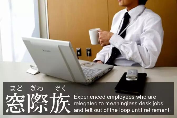 日本語には「窓際族」という言葉がある。この言葉は主に会社で出世コースから外れて閑職についた職員のことを指す。日本の企業が終身雇用制度を実施していた頃、企業は規定により職員を簡単に解雇できなかった。しかし、通常企業は出世コースから外れた職員を他の職員の仕事の邪魔にならないように窓際の席に座らせ、普段は実質的な仕事を与えずに雑務を担当させた。ここから、こういった職員は「窓際族」と呼ばれるようになった。
