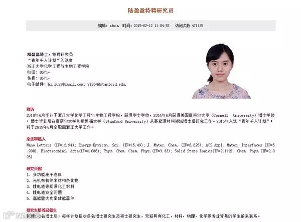 海外のハイレベル人材を誘致することを目的とした国家級優遇政策「千人計画」の公式ウェブサイトで、第11回「千人計画」青年人材リストが発表された。昨年8月に申請されてから現在までに、3回の選抜が行われ、最終的にリストの中の667人が審査に合格した。これらの海外留学から帰国したハイレベル青年人材の中で、41人が85年以降生まれの世代で、そのうち1988年11月30日生まれの最も若い陸盈盈さんはまさに「学覇」(秀才)だ。5年前に大学を卒業した陸さんは、現在「青年千人計画」に選ばれ、今年の夏から母校の浙江大学に戻り、専任教員となる予定だ。