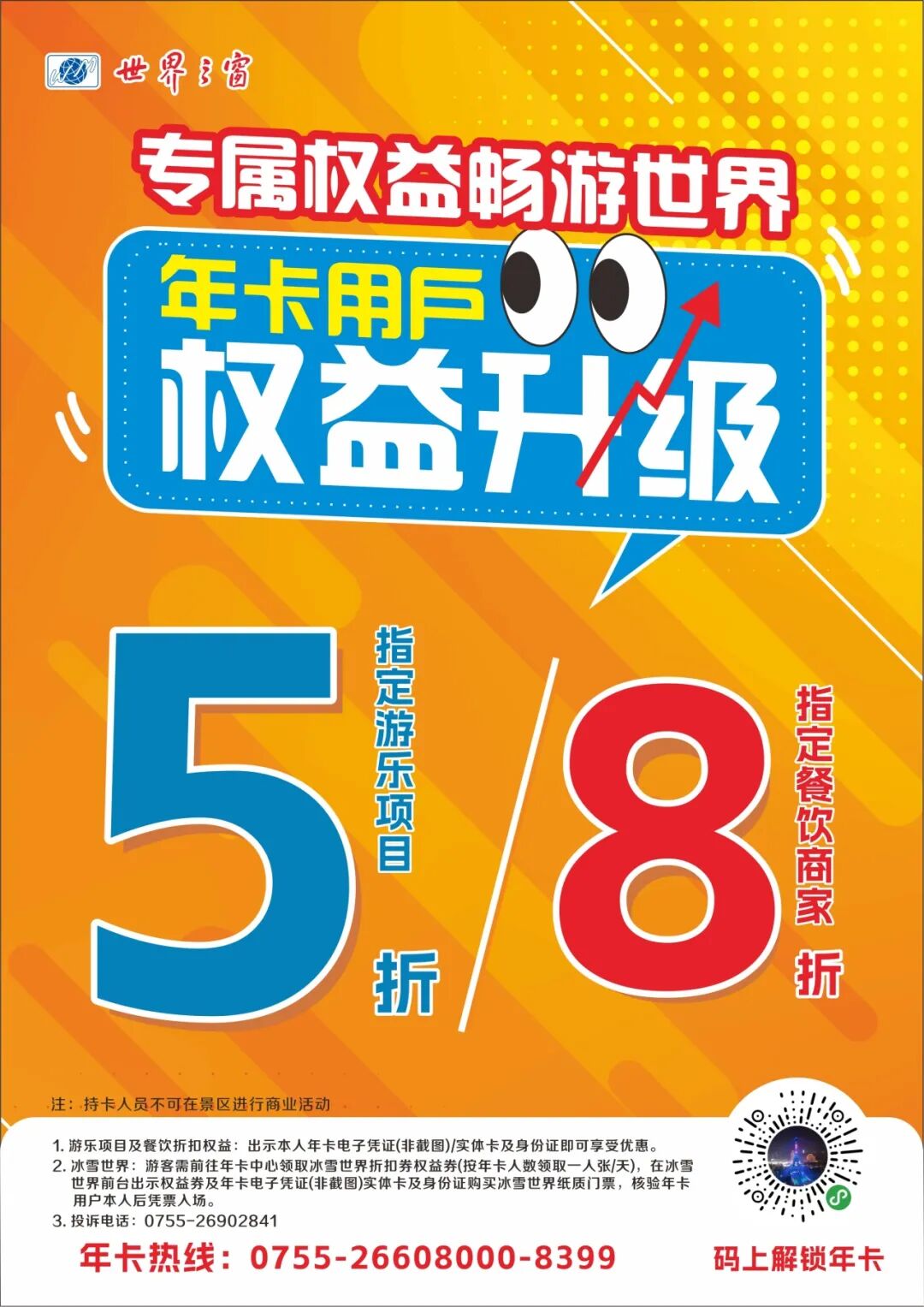 *出示本人年卡电子凭证(非截图)/实体卡及身份证,即可享受优惠。另冰雪世界5折权益25年4月开启,游客需前往年卡中心领取冰雪世界折扣券权益券(按年卡人数领取1人张/天),在冰雪世界前台出示权益券及年卡电子凭证(非截图)实体卡及身份证购买冰雪世界纸质门票,核验年卡用户本人后凭票入场。