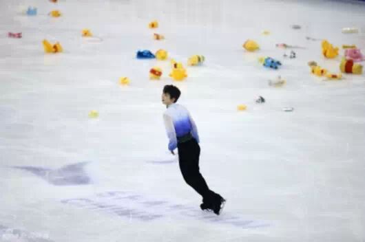 羽生結弦選手のSPの音楽はショパンのピアノ曲で、演技終了後、観客たちは持参したぬいぐるみをリングに向けて投げ込み、応援した。ぬいぐるみの多くのは羽生選手が好きなクマのプーさんで、羽生選手はリングを出る前に、その中の1つを拾って抱き上げた。