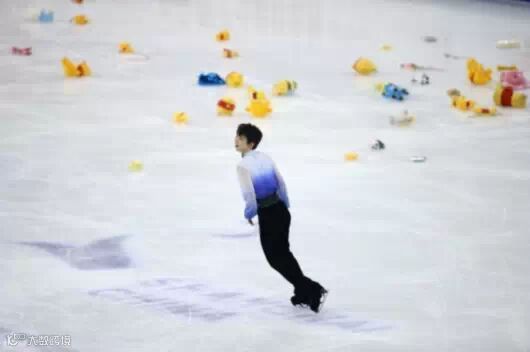 2015年世界フィギュアスケート選手権男子シングル・ショートプログラム(SP)の競技で27日、日本の羽生結弦選手は首位に立っていた。彼の競技後、競技場は「クマのプーさんの雨」に見舞われ、独特の風景を見せた。