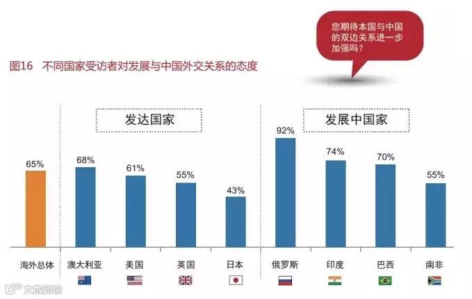 中国との外交関係を重視し、より良い発展を期待している外国の回答者は平均65%で、2013年の調査よりいくらか増加した。対中関係の継続的発展への期待が最も大きいのはロシアの国民で、「露中関係を一層強化すべき」との回答は92%に上った。