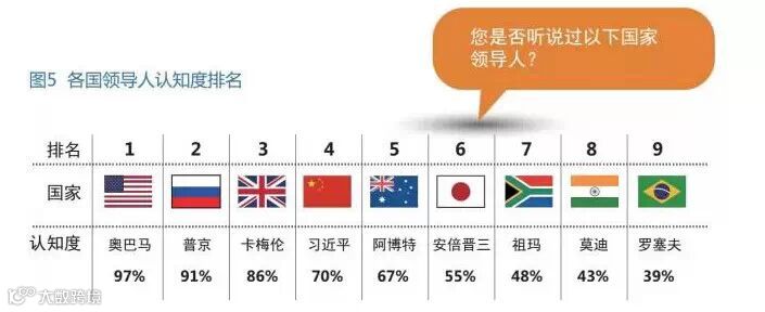 9カ国首脳の知名度では、習近平国家主席が70%で4位につけた。1位は米国のオバマ大統領(97%)、2位はロシアのプーチン大統領(91%)、3位は英国のキャメロン首相(86%)だった。