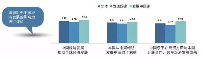 全体的に見て外国の回答者は「中国経済の発展は世界経済の発展を後押しした」「中国経済の発展から自分の国は利益を得た」「中国は経済・貿易面で自分の国と協力を繰り広げ、中国経済発展の成果を共に享受しようとしている」との見方に同意している。特に「中国経済の発展は世界経済の発展を後押しした」との見方は同意が多かった。また、中国経済の影響力を認める声は先進国より途上国で大きかった。