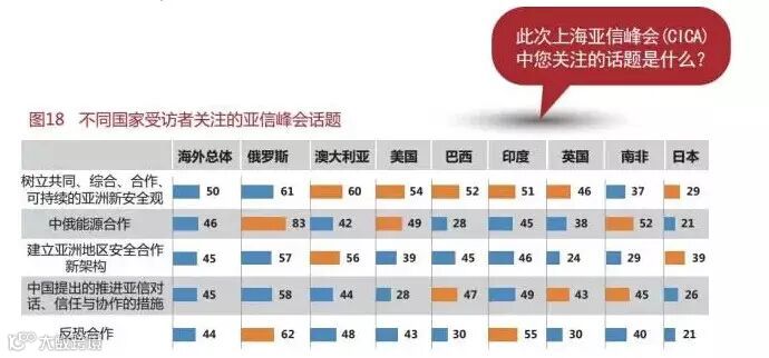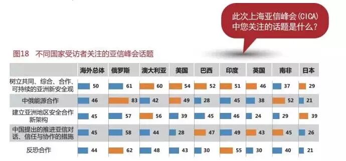 中国の習近平国家主席が2014年のアジア信頼醸成措置会議(CICA)首脳会議(上海)での演説で提唱した「共通の、総合的、協調的、持続可能なアジア新安全保障観の樹立」に、外国の回答者は一様に注目。今回のCICA首脳会議について多少知っている外国の回答者763人中、この議題を選択したのは平均50%だった。