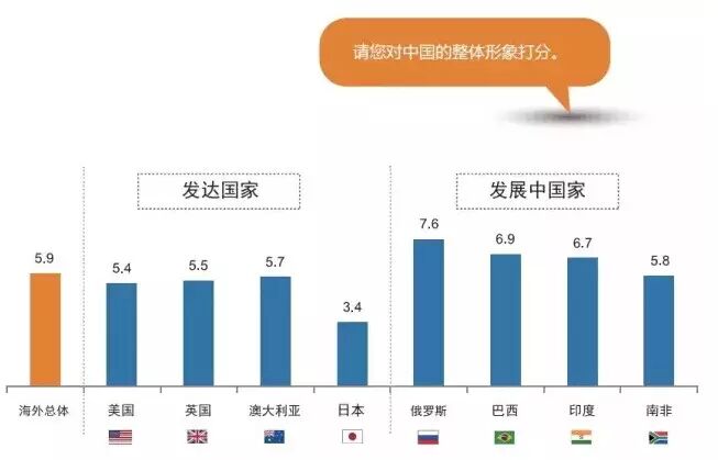 2013年の調査と比べ、中国全体のイメージ得点は0.8点上昇した(10点満点)。海外8カ国中、中国のイメージに最も高い点をつけたのはロシアで7.6点、最も低い点をつけたのは日本で3.4点だった。