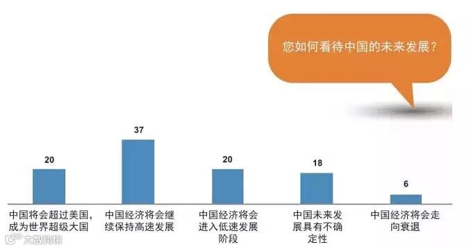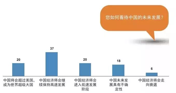 中国の将来の発展について、「中国は米国を抜いて世界の超大国になる」との回答は20%、「中国経済は高度成長を継続する」との回答は37%、「中国経済は低成長段階に入る」との回答は20%、「不確定性がある」との回答は18%、「中国経済は衰退へ向かう」との回答はわずか6%だった。中国の将来の発展については、先進国より途上国の方が有望視している。