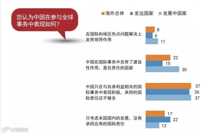 中国の国際的責任について「中国は自国の利益に関わる国際問題のみで積極的であり、まだ十分な国際的責任を担っていない」とする外国の回答者は平均37%だった。この見方が途上国でも先進国でも比較的大きな割合を占めることは注目に値する。