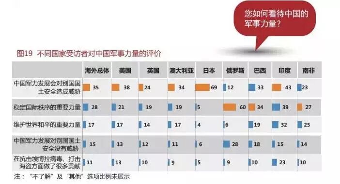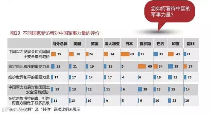 米国、英国、日本など西側国では「中国軍事脅威論」が依然一定の賛同を得ており、「中国の軍事力の発展は他国の安全を脅かす」とする外国の回答者は平均35%だった。だが一方で「中国の軍事力は国際秩序の安定や世界平和の維持における重要なパワー」との考えに同意する回答も以前より増加した。